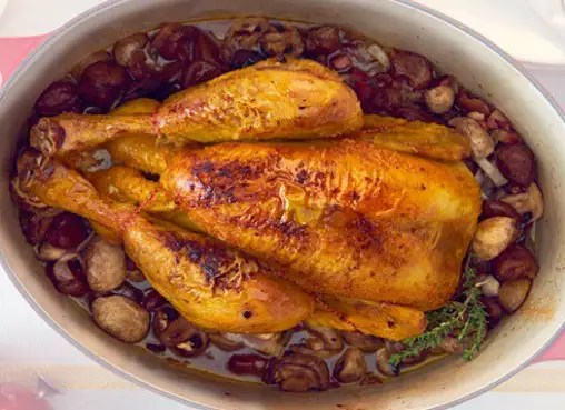 Il s’agit d’un plat traditionnel du repas de Noël en France, en Suisse romande ou au Royaume-Uni. La dinde a été découvert par Christophe Colomb aux Amériques à la fin du XVe siècle, appelée alors « poule d’Inde », l’explorateur ayant pensé avoir débarqué en Inde. Perçue comme rare et exotique, la dinde a remplacé l’oie lors du repas des fêtes de fin d’année, car moins onéreuse et plus grosse qu’un poulet. L’association avec des marrons, disponibles en hiver, se serait faite naturellement; que ce soit d’abord en Dordogne, en Ardèche ou dans le Var, principales régions productrices de marrons en France, puis dans tout la France.